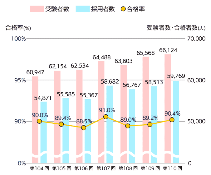 全体の合格率は90%前後ですが、新卒・既卒で合格率が大きく異なっています。新卒者の合格率は94~97%と非常に高い水準ですが、既卒者では35~45%と(約3人に1人強の合格率)大きく落ち込みます。